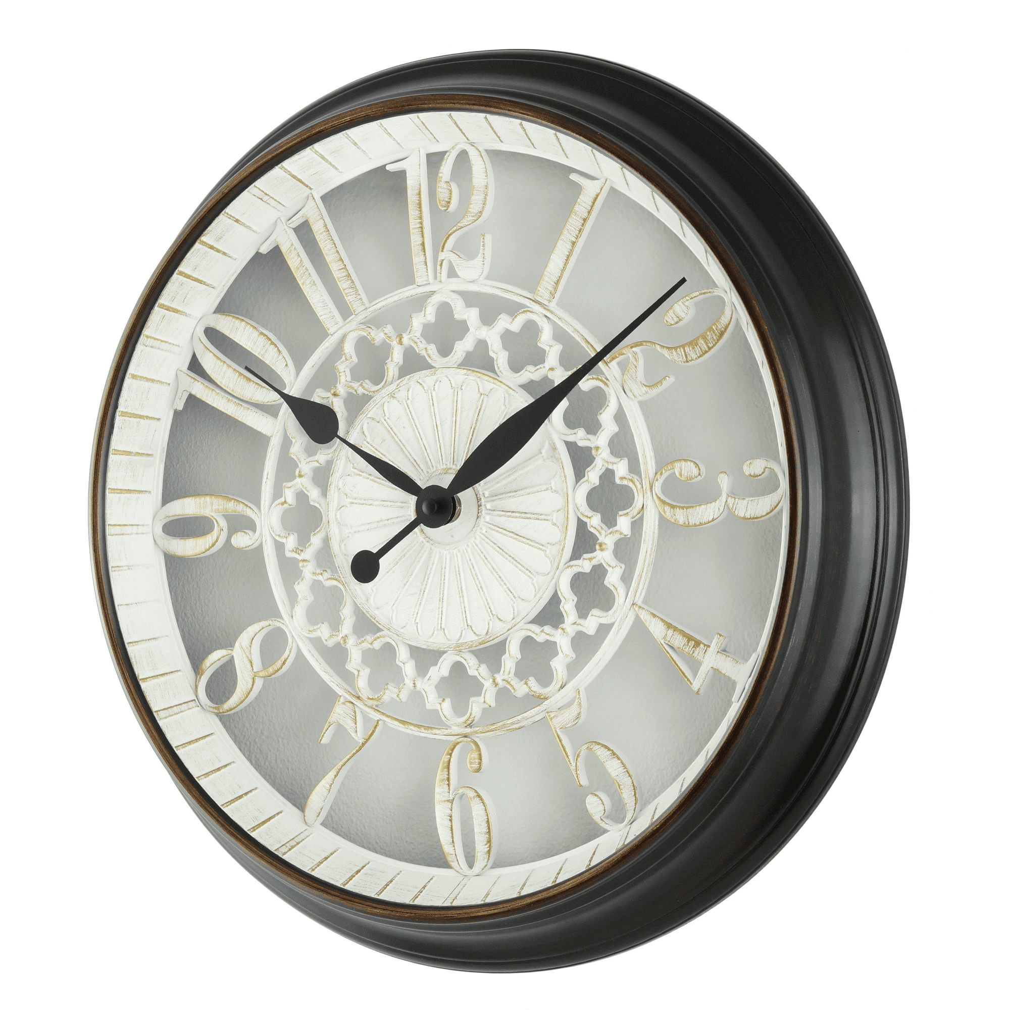 Complement your home's décor by adding this mainstays 10" white cutout wall clock! The clock's frame features a beautifully hand applied oil rubbed bronze finish, which contrasts the white center dial design. Within the frame, radiating arabic numbers rotate around the dial's center moroccan pattern design. The white cutout dial also features hand applied bronze brushing. Satin black hour and minute hands are a striking contrast and are easily visible against the dial. A flat glass lens protects the dial and handset. The clock's quality quartz movement ensures precise timekeeping. This clock would be a great decorative addition to a kitchen, bedroom or home office.