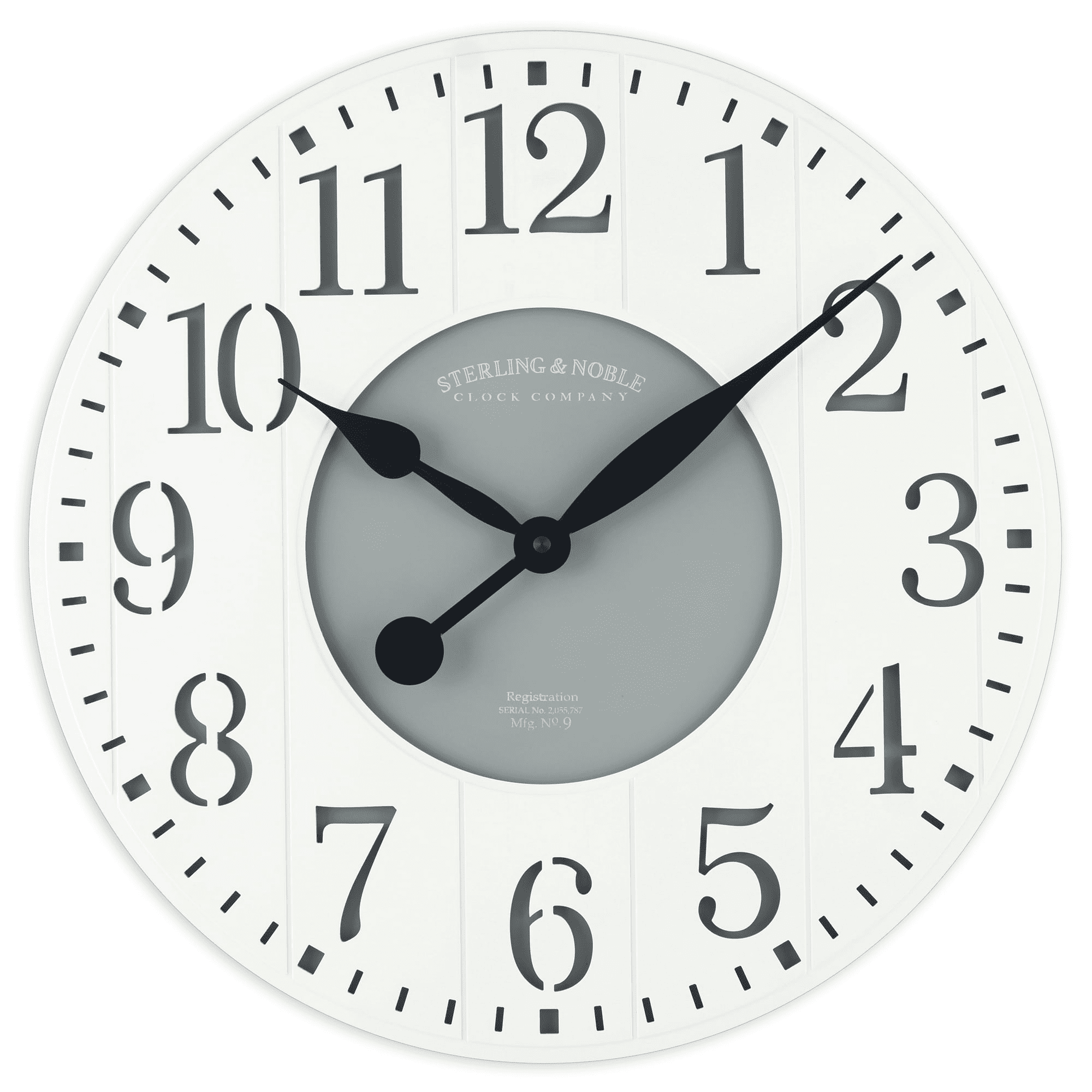 Enhance your home' s decorative appeal with this beautiful mainstays 23. 5" gray and white cutout wall clock! This timepiece is sure to impress! This clock design features a frameless design. The dial exposes laser cut arabic numbers and minute track in a white bead-board shiplap layer, which is mounted the gray dial backing. The gray and white color combination is contrasting, yet a soothing and neutral combination. Large teardrop hands featuring a satin black finish are displayed prominently against the dial, which are easily visible. The quality quarts movement of this clock ensures precise timekeeping. With a diameter of 23. 5" , this wall clock is the perfect statement piece for your home. The styling of this clock would resonate wonderfully with any decor. The bead-board shiplap layer resonates with farmhouse and coastal decor, while the simplicity of the design keeps this timepiece fresh and new. Add this mainstays 23. 5' gray and white cutout wall clock to your home and see how it amplifies your space’s style!