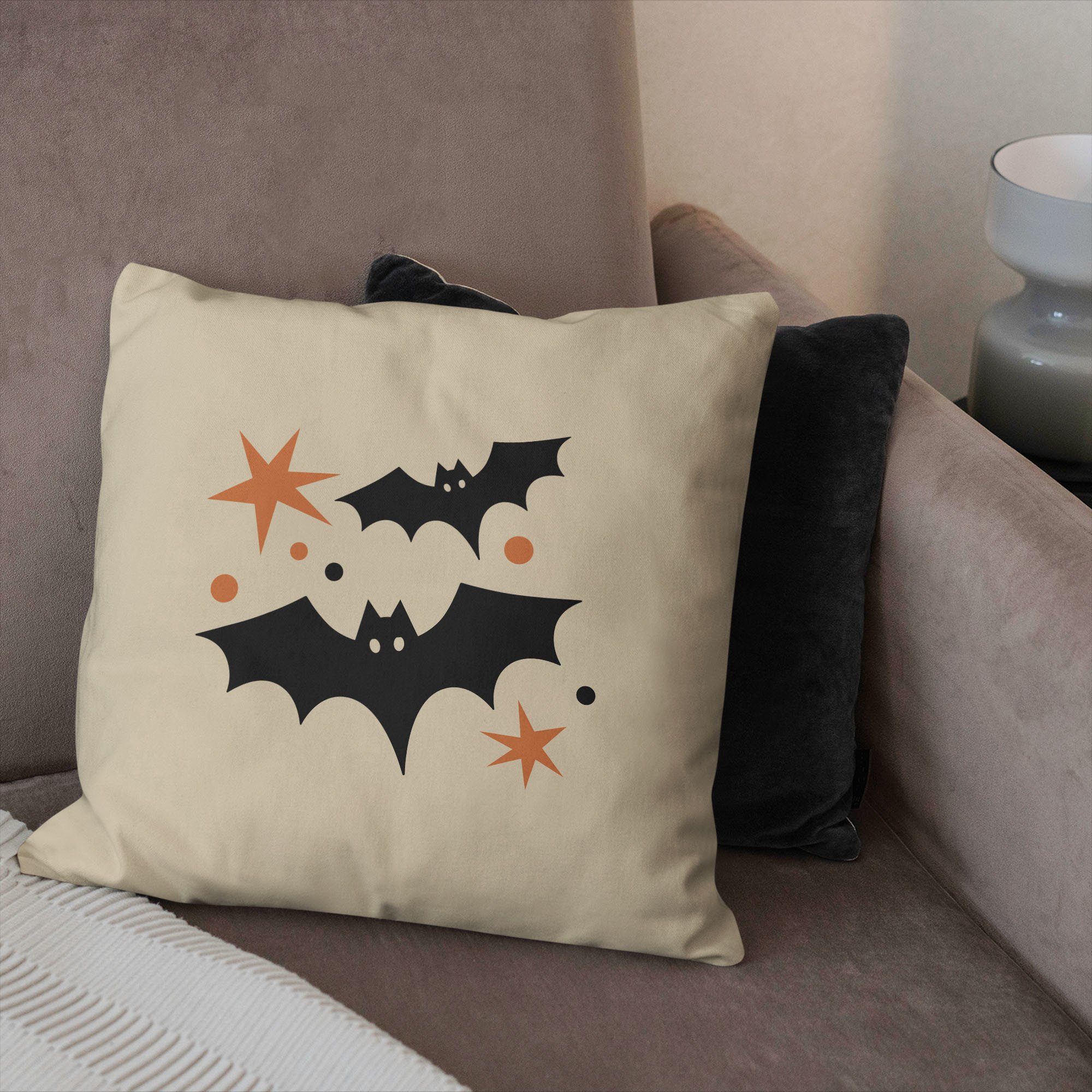 Enhance your decor with the Two Bats Throw Pillow, featuring two striking black bats paired with orange six-pointed stars. This playful design adds a festive touch to any space, making it a perfect accent for your Halloween or year-round decor. Crafted from soft, plush fabric, the Two Bats Throw Pillow provides both style and comfort. It's perfect for relaxing or adding a cozy touch to your living space, making it a delightful addition to any room.